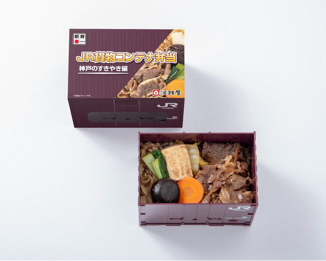 JR貨物コンテナをモチーフにした弁当箱の駅弁。その名も「JR貨物コンテナ弁当」。第一弾は「神戸のすきやき編」。人気の甘辛いすきやきをコンテナの中に盛り付けました。