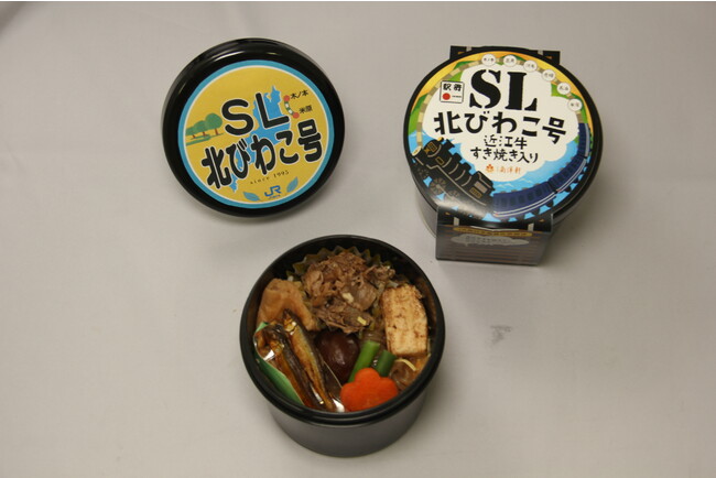 北陸本線(米原~木ノ本間)を走るSL北びわこ号をイメージした、近江牛すき焼き入りの駅弁です。