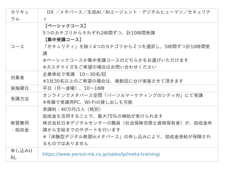 パーソルマーケティング株式会社(本社: 東京都新宿区、代表取締役社長: 鈴木 博之、以下パーソルマーケティング)は、一般社団法人メタバース推進協議会(所在地: 東京都千代田区、代表理事: 養老 孟司氏、以下メタバース推進協議会)や東大松尾研発スタートアップなど各有識者が監修した教材をもとに、2025年4月よりメタバース(仮想空間)上で『体験型デジタル教習inメタバース』の提供を開始します。