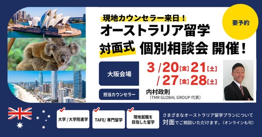 ラグザス株式会社(本社:大阪市北区、代表取締役社長:福重 生次郎)のグループ企業であるTMR GLOBAL GROUP PTY LTD(本社:ゴールドコースト・オーストラリア、代表者:斎木航、内村政則)は、オーストラリアでの永住権取得や現地就職を目指す方、ならびに高校在学中または卒業後、オーストラリア大学・大学院への進学を検討している方を対象に、3月に大阪で完全個別形式の留学説明会を開催いたします。