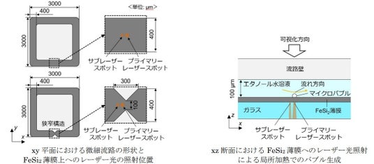 光を吸収して熱に変換する特性を持つ厚さ0.1µmのFeSi2薄膜(※7)とレーザー光を用いて、この薄膜上にバブルを生成するためのレーザー照射点(プライマリーレーザースポット)と、温度分布を制御するためのレーザー照射点(サブレーザースポット)を設定し、エタノール水溶液の流路内部に、内部が高温蒸気で満たされた直径10µmのマイクロバブルを生成しました。このバブルによって生じた駆動力のみで、従来のEHDポンプ(※8)を用いた場合と同等の流速100µm/sを実現し、断面の寸法が100µm×400µm、一辺3mmの正方形の流路内で流れを循環させることで、数ミリメートルの流れを生成することに世界で初めて(※1)成功しました。