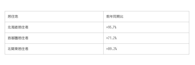北海道新幹線沿線の北海道函館エリアや青森県・岩手県・宮城県は開業とともに旅行先としての注目度が高まり、沿線周辺エリア全体で前年同期比+65.7%(約1.7倍)と伸びています。居住地別の予約状況では、首都圏居住者(※3)が同+73.6%(約1.7倍)、北関東居住者(※4)が同+88.1%(約1.9倍)と関東エリア(首都圏・北関東)から沿線周辺エリアへの予約が昨年比で多く増えています。