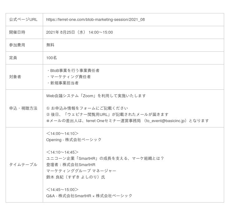 オールインワン型BtoBマーケティングツール「ferret One(フェレットワン)」を運営する株式会社ベーシック(本社:東京都千代田区、代表取締役:秋山勝、以下ベーシック)は8/25(水)14時より、デジタルマーケティングに取り組むBtoB企業の担当者の方に向けたイベント「BtoB Marketing Session 2021~デジタル化時代のマーケ組織の立ち上げ方~」を開催いたします。