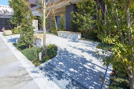 本物件では、太陽光発電パネルを屋上に設置し、マンション共用部で使用する電力の一部を再生可能エネルギーによって賄う計画となっています。また、街並みに緑の潤いをもたらす景観演出として、道路側のポケットパークとともにファサード面に壁面緑化を採用しています。