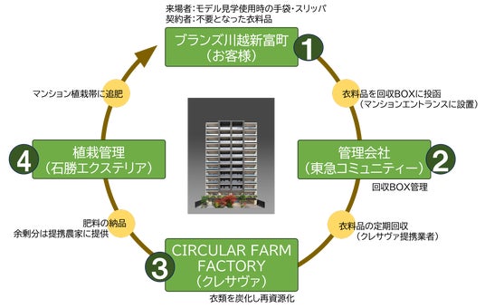 東急不動産ホールディングスグループは、環境ビジョン「都市と自然をつなぐ。ひとと未来をつなぐ。」を掲げており、ひとと自然をつなぐ取り組みの一環として森林保全活動や都市の緑化を積極的に行っております。本取り組みはこの一環として、本物件の入居者から引越しにあたり不要となった衣料品や、本物件のモデルルーム来場者から見学時に着用する手袋・スリッパを専用ボックスにて回収し、その衣料品を植物の肥料に再資源化し、マンション内の植栽帯に散布することで、緑に囲まれた生活を資源循環の輪の中で実現するものです。