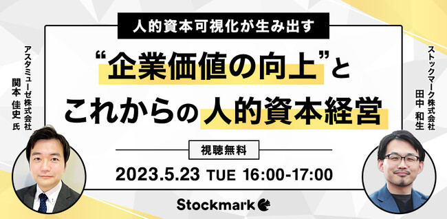 アスタミューゼ株式会社(本社:東京都千代田区、代表取締役社長 永井歩)と最先端の自然言語処理AIを活用した情報収集サービス『Anews・Astrategy』を提供するストックマーク株式会社(本社:東京都港区、代表取締役CEO 林達)は、2023年5月23日(火)16:00-17:00に、「人的資本可視化が生み出す“企業価値の向上”とこれからの人的資本経営」と題した無料ウェビナーを共同開催いたします。