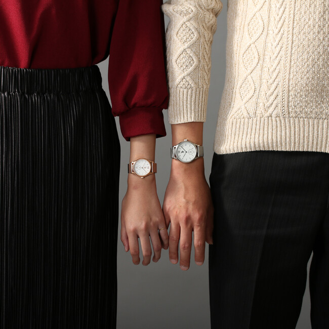 文字盤の中心にブランドロゴを配置したシンプルな装いで、洗練された印象を与える腕時計『classico(クラシコ)』。6時位置にはスモールセコンドを設置し、メンズモデルにはデイト表示がされています。