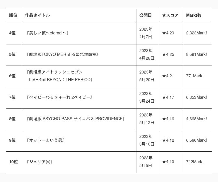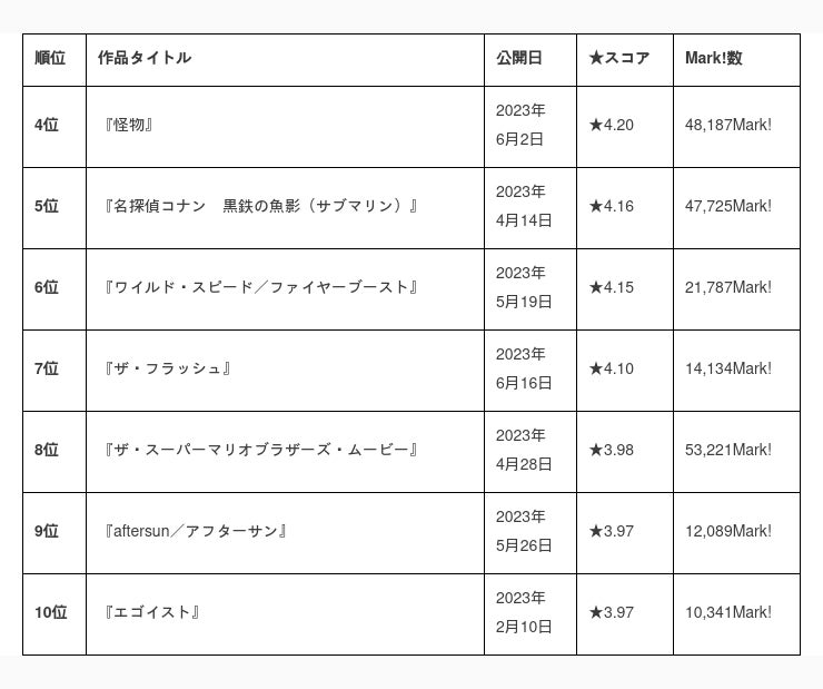 2023年(2023年1月1日から2023年6月30日までの間)に、国内の映画館で公開された映画を対象に、Filmarksのデータをもとにした「2023年上半期 映画ランキング」を算出しました。