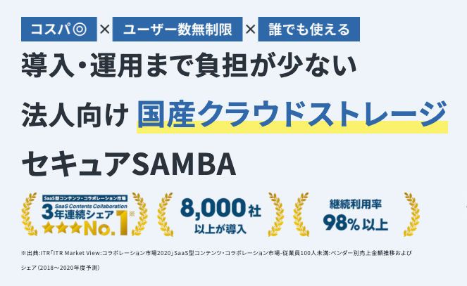 セキュアSAMBA(https://info.securesamba.com/)は、8,000社以上の導入実績と98%以上の継続利用率を誇る法人向けの国産オンラインストレージサービスです。AWS(アマゾン ウェブ サービス)を基盤とした世界トップクラスのセキュリティを標準搭載し、データの暗号化や24時間体制の監視、国内複数拠点への自動バックアップにより、オンプレミス同等以上の安全性を実現しています。料金面では、ユーザー数無制限の「データ容量課金」を採用しているため、従業員数が増えてもコストが急増せず、中小企業でも安心して導入できるシンプルな設計となっています。また、ITに不慣れな方にもわかりやすい操作感で利用でき、日本人専任スタッフが導入から定着までを手厚く伴走サポートすることで、社内でのスムーズな活用を支援します。