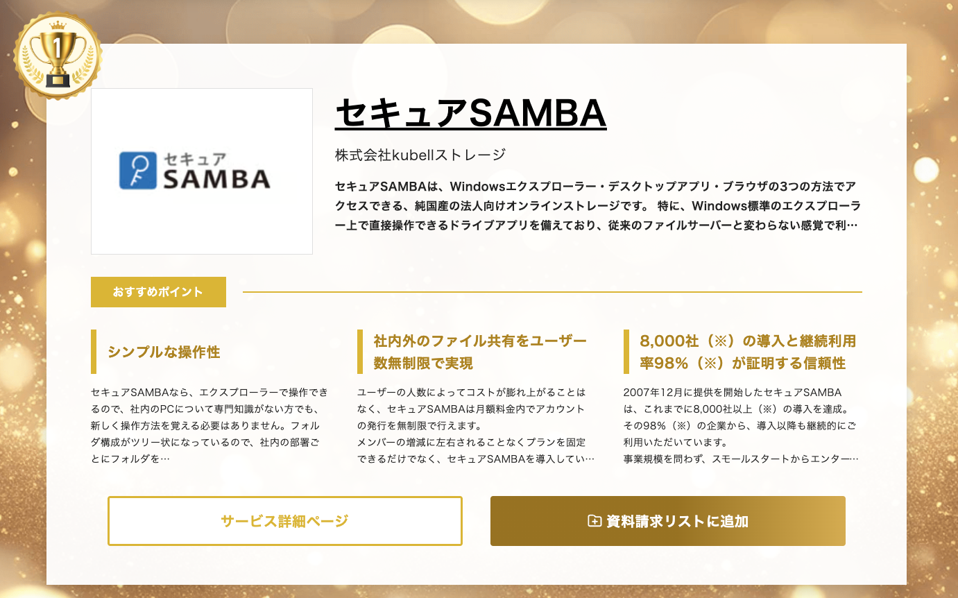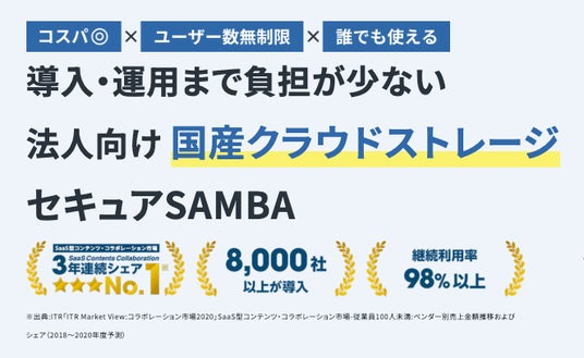 株式会社kubellストレージ(本社:東京都港区、代表取締役社長:中 哲成)が運営するオンラインストレージサービス「セキュアSAMBA」は、スマートキャンプ株式会社(本社:東京都港区、代表取締役社長:林 詩音)が主催する「2025年下半期 BOXIL資料請求数ランキング」オンラインストレージカテゴリで総合1位を獲得したことをお知らせいたします。