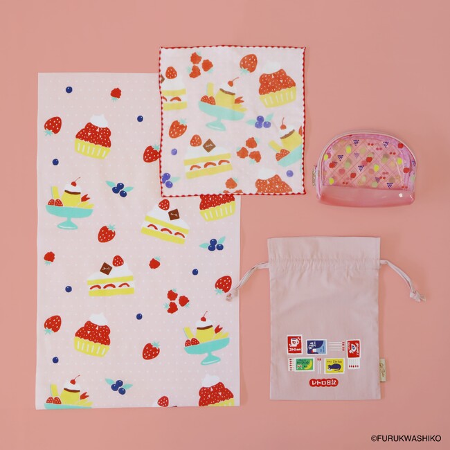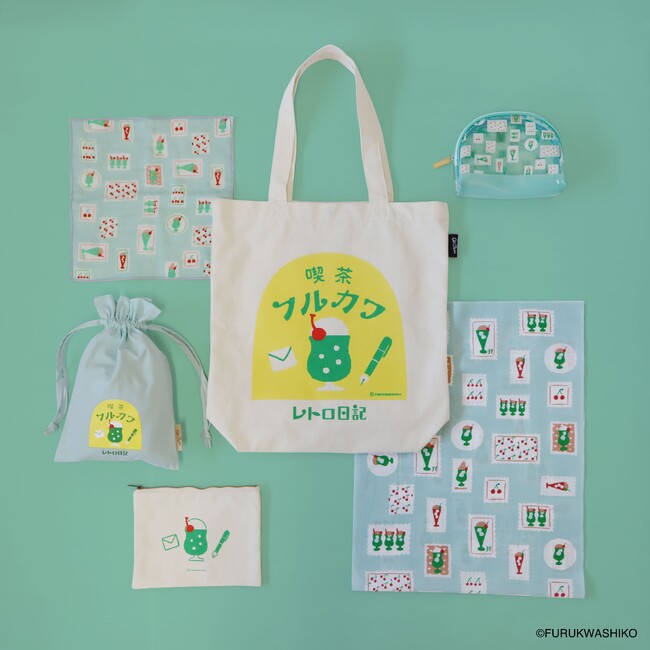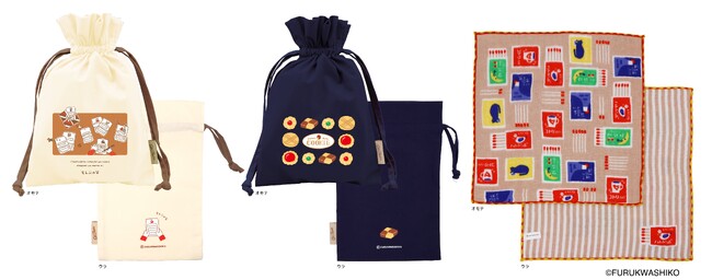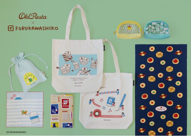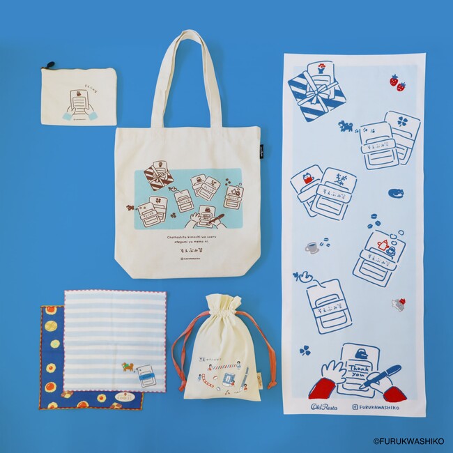今回発売するのは、古川紙工で人気の文具シリーズ「そえぶみ箋」「喫茶フルカワ」「お菓子などうぶつ工房」「オトメ時間」「レトロ日記」「わたしびより」の、ほっこりかわいい手書きイラストをモチーフにしたトートバッグやハンカチ、巾着など5アイテムです。いずれも「Old Resta」の人気アイテムとのコラボ商品となっており、古川紙工の特徴である温かみのあるイラストを、「Old Resta」らしい普段使いしやすい雑貨に落とし込みました。
