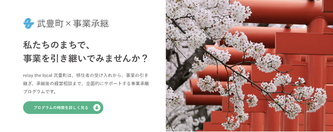 このたび武豊町とrelayは、移住・定住を伴う第三者事業承継の推進に向けて、共に取り組んでまいります。提携の第一弾として、武豊町に特化した後継者募集案件を掲載した「relay the local 武豊町」を開設しました。今後、武豊町に相談が寄せられる後継者不在事業者の情報をrelayに提供いただき、「relay the local 武豊町」への掲載を行います。