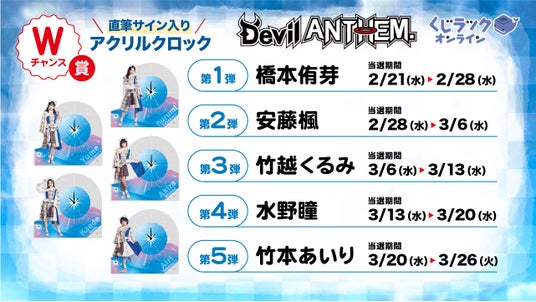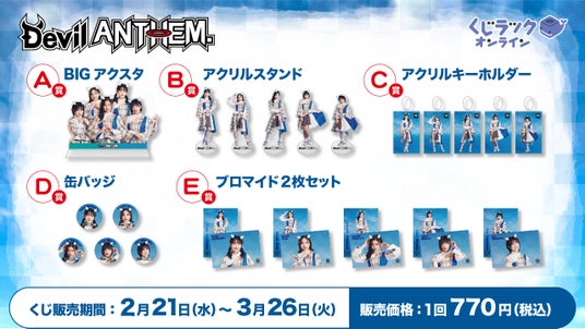 カルチュア・エンタテインメント株式会社(以下、CE)は、アイドルグループ『Devil ANTHEM.』とコラボレーションした、ハズレ無しでキャラクターグッズがゲットできるオンラインくじ「くじラックオンライン」を2024年2月21日(水)より発売いたします。賞品はA賞~E賞まで5アイテム(全30種)となっております。さらに、くじ1枚ご購入ごとにWチャンス賞の抽選が行われ、当選した方はメンバーの直筆サイン入りの特別な賞品が獲得できます。