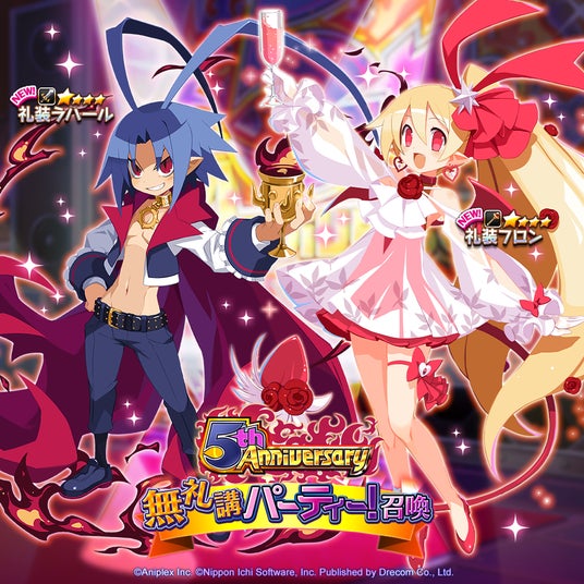 株式会社ドリコム(本社:東京都品川区、代表取締役社長:内藤裕紀)は、スマートフォン向けゲーム『魔界戦記ディスガイアRPG ~最凶魔王決定戦!~』にて、5th Anniversary MAPイベント「新たな魔王ブリーダー決定!?無礼講すぎる5周年パーティー!」を2024年11月5日(火)15:00より開催いたしました。「礼装ラハール」 「礼装フロン」が新たに参戦し、イベント報酬には「悪魔殺しのサルディア」が登場します。