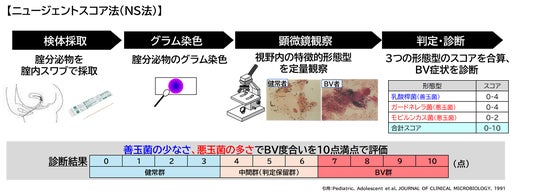ニュージェントスコア法はBV検査のゴールドスタンダードです。腟分泌物をグラム染色して顕微鏡で観察し、乳酸桿菌(善玉菌)の少なさや悪玉菌(ガードネレラ菌、モビルンカス菌)の多さを10点満点で評価する検査法です。0~3点を健常群、4~6点を中間群、7~10点をBV群とされています。