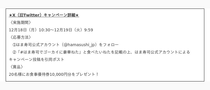 X(旧Twitter)はま寿司公式アカウントでは、フェア開催を記念し、抽選で20名様に10,000円分のお食事優待券が当たるキャンペーンを実施します。ふるってご参加ください!