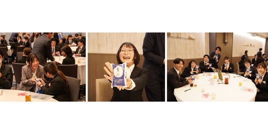 創立20周年を記念し、これまでの歩みを題材にした企画動画を上映。社歴の長い社員や新卒入社1期生の社員へのインタビューをもとに、当時のエピソードをクイズ形式で出題し、各テーブルで新入社員と先輩社員が協力して回答を考えるなど、各会場で活発な交流が生まれました。