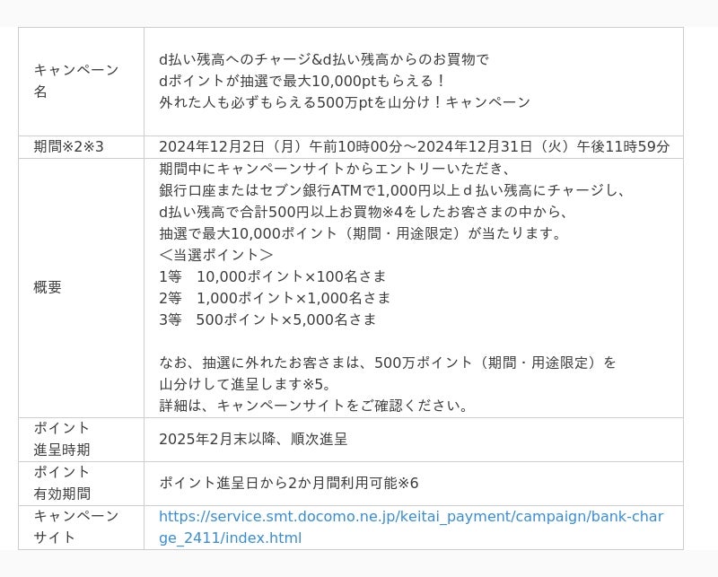株式会社NTTドコモ(以下、ドコモ)は、「d払い(R)」アプリのd払い残高※1に1,000円以上チャージし、d払い残高から合計500円以上お買物をしたお客さまの中から抽選でdポイント(期間・用途限定)が当たる「d払い残高へのチャージ&d払い残高からのお買物でdポイントが抽選で最大10,000ptもらえる!外れた人も必ずもらえる500万pt山分け!キャンペーン」を2024年12月2日(月)から2024年12月31日(火)まで開催いたします。