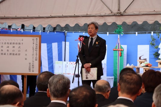 田中明高山市長は「地域住民の生活の利便性を向上させる悲願の道路。安全第一で技術力を最大限発揮し工事を進めてください」と挨拶。施工者を代表し大日本土木株式会社の松雅彦社長は「重要な道路工事であり、無事故で立派なトンネルができるよう取り組んでいきたい」と挨拶しました。