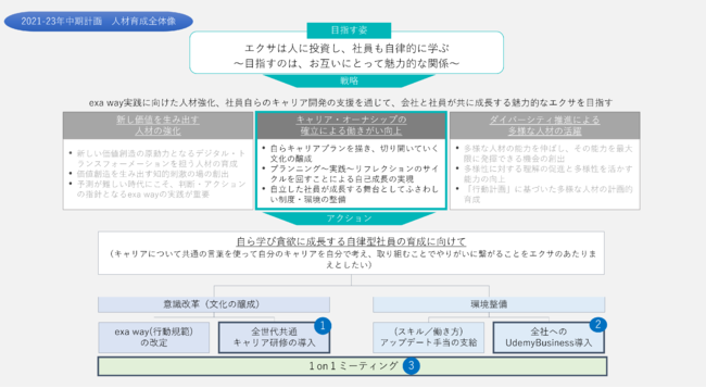 目指すのは、 会社と社員がともに成長する魅力的なエクサです。具体的には、行動規範の改定、全世代向けのプロティアンキャリア研修導入、全社員の学びのプラットフォームとしてのUdemy Businessの導入、1on1ミーティングによる支援などです。