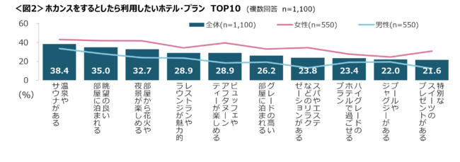 利用したいホテルやプランは「温泉やサウナがある」が最も高く、続いて「眺望の良い部屋」「花火や夜景が楽しめる」が上位にあがる。<図2>