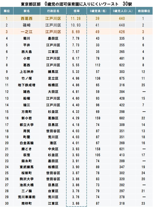 駅別ランキングでは、西葛西駅(江戸川区)が2年連続で最上位となり、0歳児の認可相当保育施設に最も入りにくい駅となっています。同駅では0歳児定員が7.1%減少しており、特に需給の厳しさがさらに強まりました。2位の篠崎駅(同区)は認可相当0歳児定員が増加したものの、未だ高倍率の状況が続いています。