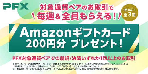株式会社 マネーパートナーズ(代表取締役社長:福島秀治、本社:東京都港区、以下「マネーパートナーズ」)は、2023年1月16日(月)よりパートナーズFXの対象通貨ペアで、新規・決済どちらか1回以上のお取引をされた方に、もれなくAmazonギフトカードをプレゼントするキャンペーン実施いたしております。
