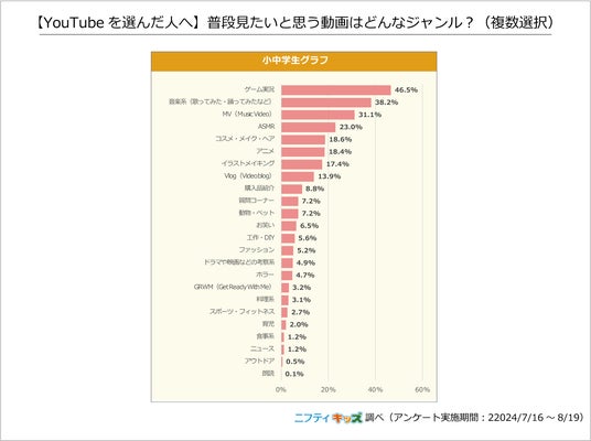 小中学生に人気の動画ジャンルは「ゲーム実況」でした。次いで多かったのが、音楽系(歌ってみた・踊ってみたなど)です。子どもたちにも人気のVTuberが、ゲーム実況や音楽系動画で活躍している影響が大きいのかもしれません。