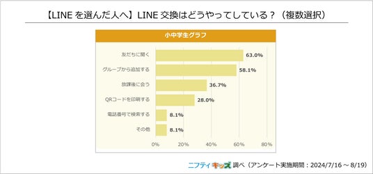 LINEの交換は「友だちに聞く」と回答した人が最も多く、次が「グループから追加する」となりました。「QRコードを印刷する」など工夫をしている人もいるようです。