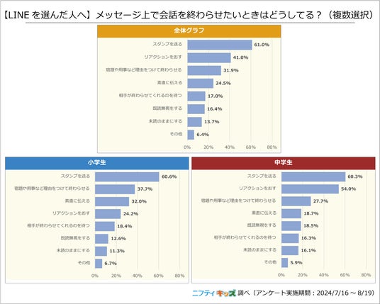 ただし2位は、小学生では「宿題や用事など理由をつけて終わらせる」、中学生では「リアクションを押す」でした。リアクションは相手に通知されないため、会話を終わらせやすいと考えているのかもしれません。