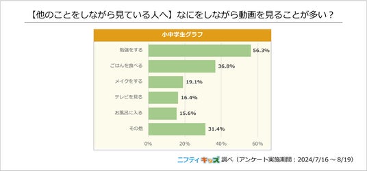 YouTubeを見ながらなにをするのかを聞くと、「勉強をする」が56.3%、次いで「ごはんを食べる」が36.8%でした。