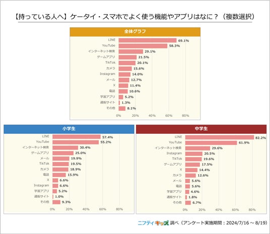 よく使う機能やアプリについては、小中学生ともに「LINE」が1位となりましたが、小学生は57.4%、中学生は82.2%となっており、数字に大きな差がありました。中学生になると、小学生のときに比べて行動範囲と交友関係が一気に広がり、人と連絡をとるアプリがより重要となってくるのかもしれません。