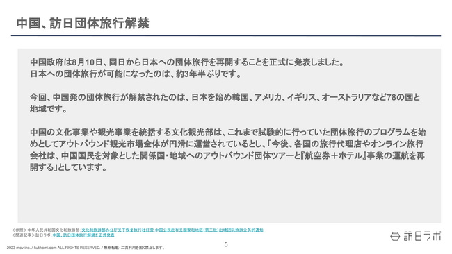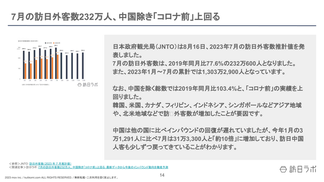 中国、日本への団体旅行解禁 / 7月の訪日外客数232万人、中国除き「コロナ前」上回る ほか