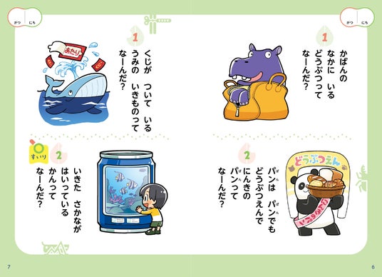 動物や虫、魚、食べ物などの身の回りのものから連想や、絵や文字を見て想像する問題、数字に関係する問題まで、夢中になれること間違いなし!
