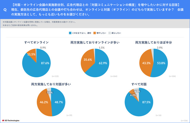 一方、対面(オフライン)での会議割合が多い広告主は、4割前後が対面会議の頻度を増やしたいと考えており、対面での会議・打ち合わせのニーズが一定数あることもわかりました。これは、直接顔を合わせることによる「ディスカッションが活発になりやすい」「些細な質問・相談がしやすい」「信頼関係が構築しやすい」などのメリットを広告主が認識しているためと考えられます。