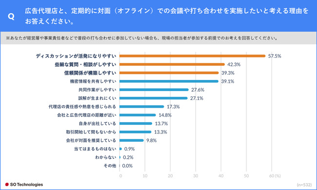 広告代理店と、定期的に対面(オフライン)での会議や打ち合わせを実施したい理由について聞いたところ、「ディスカッションが活発になりやすい」が57.5%、「些細な質問・相談がしやすい」が42.3%、「信頼関係が構築しやすい」が39.3%、「機密情報を共有しやすい」39.1%と続いた。(n=532、複数選択)