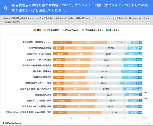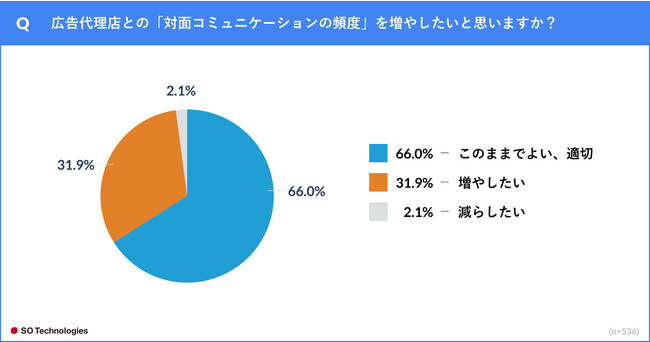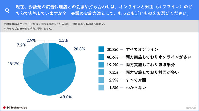 ソウルドアウト株式会社(本社:東京都文京区 代表取締役社長CEO兼CCO:荒波 修)の連結子会社であり、マーケティングテクノロジーの力で地域活性化を推進するSO Technologies株式会社(本社:東京都文京区 代表取締役:荒木 央、以下「当社」)は、インターネット広告を広告代理店に委託している広告主548人(※)を対象に、「インターネット広告代理店との会議・打ち合わせに関する調査」を実施しました。