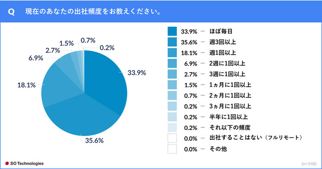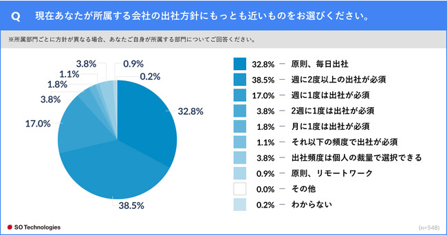 一方、回答者の所属する企業としての出社方針では、「原則、毎日出社」が32.8%、「週に2度以上の出社が必須」が38.5%、「週に1度は出社が必須」が17.0%と、計88.3%が週1回以上の出社を求めていることもわかった。(n=548)