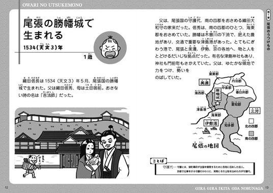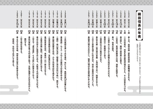 織田信長の誕生から、年齢順に見開きごとに構成したつくりで、