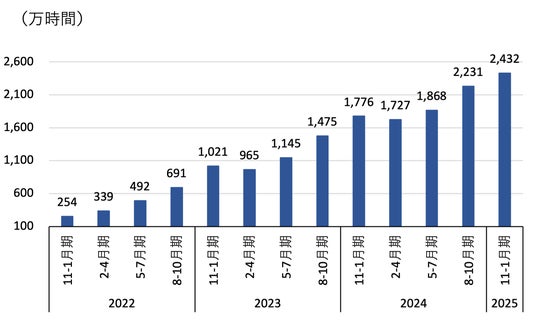 ・2025年1Q(2024年11月-2025年1月期)の延べ総労働時間(稼働実績)は2,432万時間(前年同期比+36.9%)