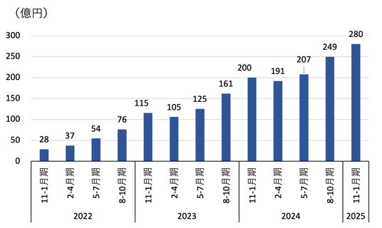 ・2025年1Q(2024年11月-2025年1月期)の総賃金額(実績)は280億円(前年同期比+40.2%)