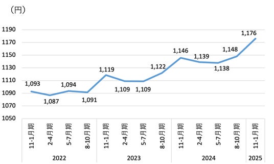 ・2025年1Q(2024年11月-2025年1月期)の三大都市圏のスポットワーク平均時給は1,176円(前年同期比+2.6%)
