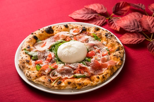 内容:ミルクのコクがたまらないイタリア産ブラータと生ハムの映えピッツア。パルミジャーノの粉チーズを振りかけて。