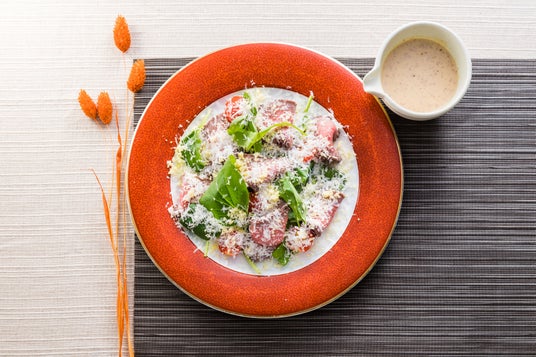 内容:黒毛和牛のローストビーフとベビーリーフのサラダに、削りたてチーズと粉チーズをかけて。胡麻ドレッシング付き