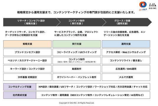 株式会社GIGは、コンテンツマーケティングの戦略策定から実行、運用までをトータルで伴走支援する『コンマルク(https://www.conmark.jp/)』をリリースいたしました。