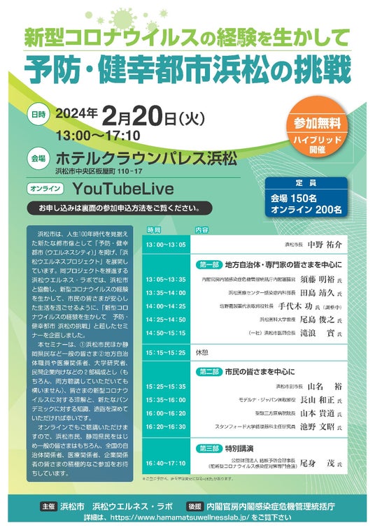このたび、同プロジェクトを推進する本市と浜松ウエルネス・ラボ※が協働し、新型コロナウイルスの経験を生かして、市民の皆さまが安心した生活を過ごせるように、「新型コロナウイルスの経験を生かして 予防・健幸浜松の挑戦」と題したセミナーを下記のとおり開催いたします。