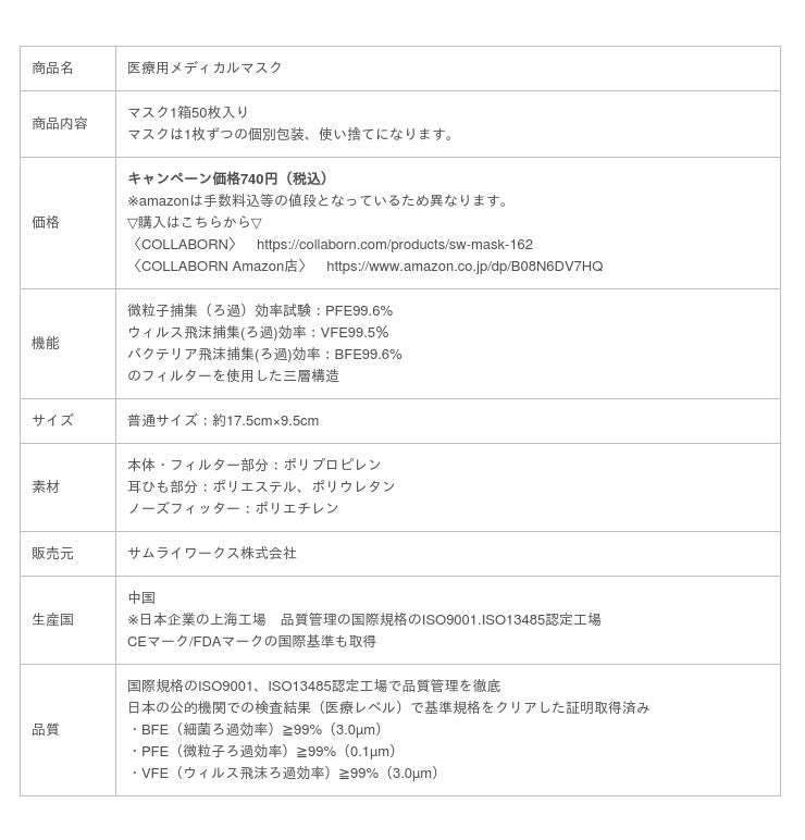 サムライワークス株式会社(代表取締役社長:新島 実 本社所在地:東京都渋谷区)は、相次いで発令される緊急事態宣言を受け、医療現場で使われる高品質で高密度の医療用不織布マスクを一般家庭でもご使用いただけるよう『医療用メディカルマスク』の販売を開始致します。『医療用メディカルマスク』は、品質管理の国際規格ISO9001、ISO13485の認定工場で、徹底した品質管理の基に製造を行い、徹底した品質管理で製造されたマスクの性能を日本の検査機関で厳しい検査を受け、PFE99.6%、BFE99.6%、VFE99.5%と医療用としての規格基準を大幅に上回った証明取得済のマスクです。感染拡大が広がる今、あらゆる不織布マスクが市場で販売されておりますが、安心・安全を謳っている日本製の不織布マスクや、医療用マスクは1箱(50枚入)が3000円~6000円と高値で販売されておりますが、それ以上の品質管理で製造され、性能が実証されている安心・安全・高性能の『医療用メディカルマスク』を特別価格の740円(税抜)で販売致します。