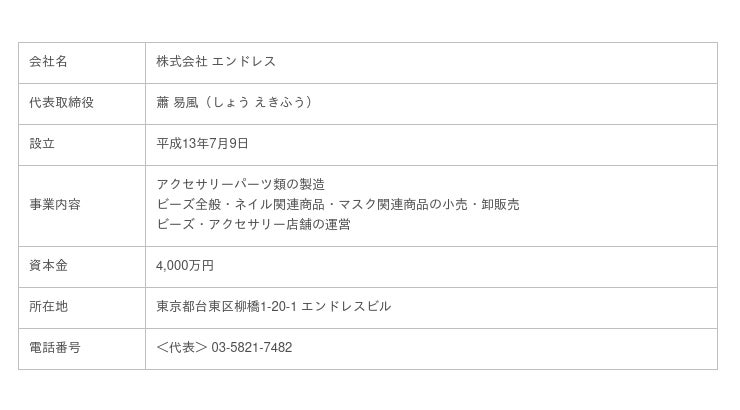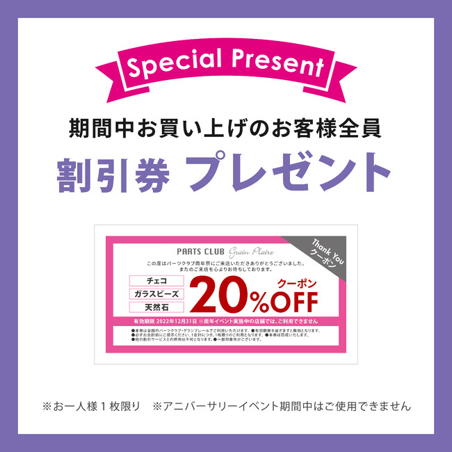 ビーズやアクセサリーパーツなどの企画・製造・販売をする株式会社エンドレス(本社:東京都台東区、代表:代表取締役 蕭(しょう)易風(えきふう))が運営するビーズ&アクセサリーパーツショップ「PARTS CLUB」各店舗にて開催されるアニバーサリーイベント。セールだけでなくお得なHAPPY BAGの限定販売やノベルティプレゼントなどを行います。