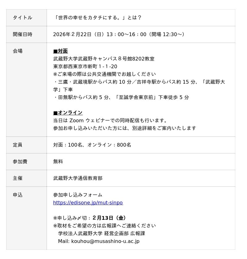 武蔵野大学(東京都江東区・西東京市)は、2月22日(日)に武蔵野大学通信教育部シンポジウム【「世界の幸せをカタチにする。」とは?】を開催します。