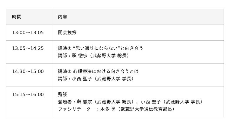 第二部では、精神科医・公認心理師として、長年にわたりトラウマケアや犯罪被害者支援の現場に携わってきた小西 聖子学長が登壇。「心理療法における向き合うとは」をテーマに、心の専門家の立場から、困難な状況や心の傷との適切な距離の取り方について論じます。そして最後には、通信教育部長の本多勇教授を交えた特別鼎談(ていだん)を実施。 本学のブランド・ステートメントである「世界の幸せをカタチにする。」をテーマに、学問の領域を超えた対話を通じて、私たちが社会でどう生き、どう貢献できるのかを深掘りします。